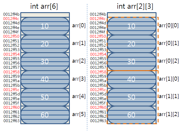 즉 arr[0]은 &arr[0][0]의 또다른 표현일 뿐, arr[0]라는 공간이 따로 확보된 것이 아니다.