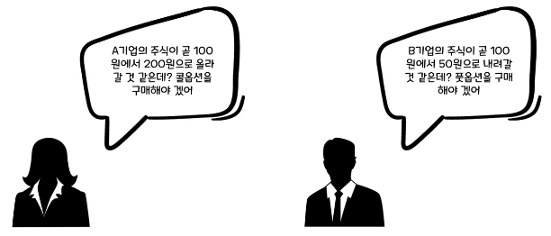 옵션이란, A 기업의 주가를 기준으로 구매하는 것이 아니라 현재 시장의 옵션 계약 가격을 투자함으로써 A 기업의 주식을 특정 가격(행사가)에 살 수 있는 권리(분양권)를 구매하게 됩니다.
