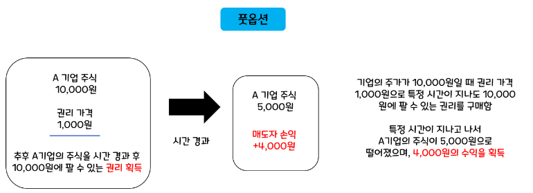 어떤 사람이 A기업의 주식을 10,000원에 팔 수 있는 권리를 1,000원으로 구매하였습니다. 며칠 후 A기업의 주가가 5,000원으로 떨어졌으며, 바로 10,000원에 매도 함으로써 총 4,000원의 수익을 얻었습니다.