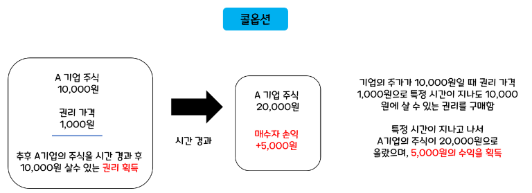 어떤 사람이 권리금 1,000원으로 A기업의 주식을 10,000원에 살 수 있는 권리를 구매하였습니다. 2주가 지났는데, A기업의 주가가 20,000원으로 상승하였고, 매수를 함으로써 총 5,000원의 수익을 얻었습니다.