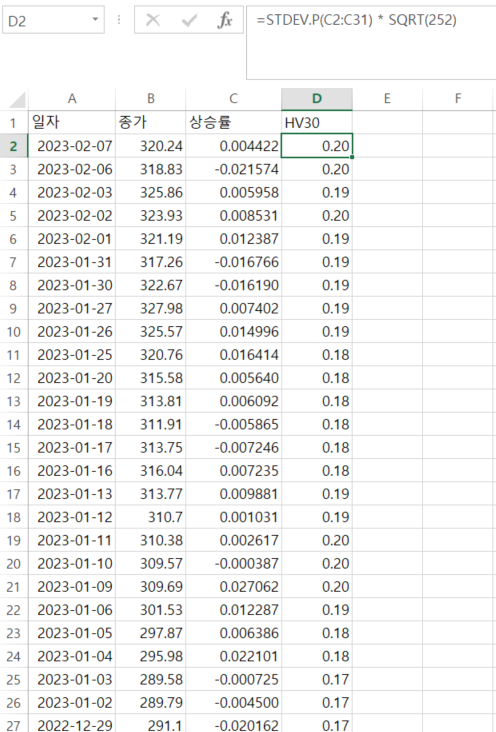 아래 엑셀은 KOSPI200의 역사적 변동성을 구한 예시이다.