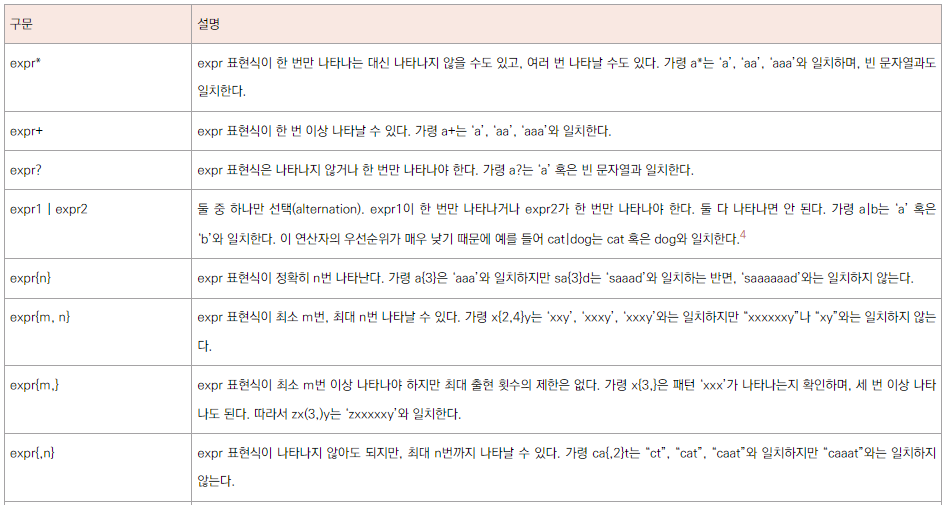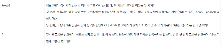- \숫자 : 그룹을 지칭. 해당 그룹에 매칭된 문자열과 동일한(패턴X, 내용O) 문자열을 검색