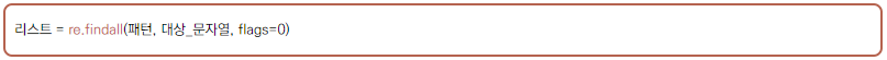 - 대상_문자열 에서 패턴에 해당하는 모든 결과를 리스트로 반환
